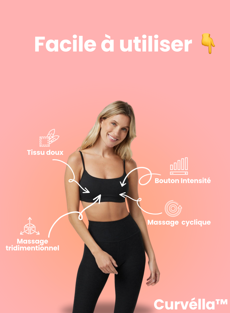 Éliminez vos douleurs mammaire grâce à son massage chauffant apaisant. Chaque utilisation de la brassière Curvélla stimule la production d’ocytocine, l’hormone du bien-être, pour un soulagement durable et un confort absolu au quotidien.